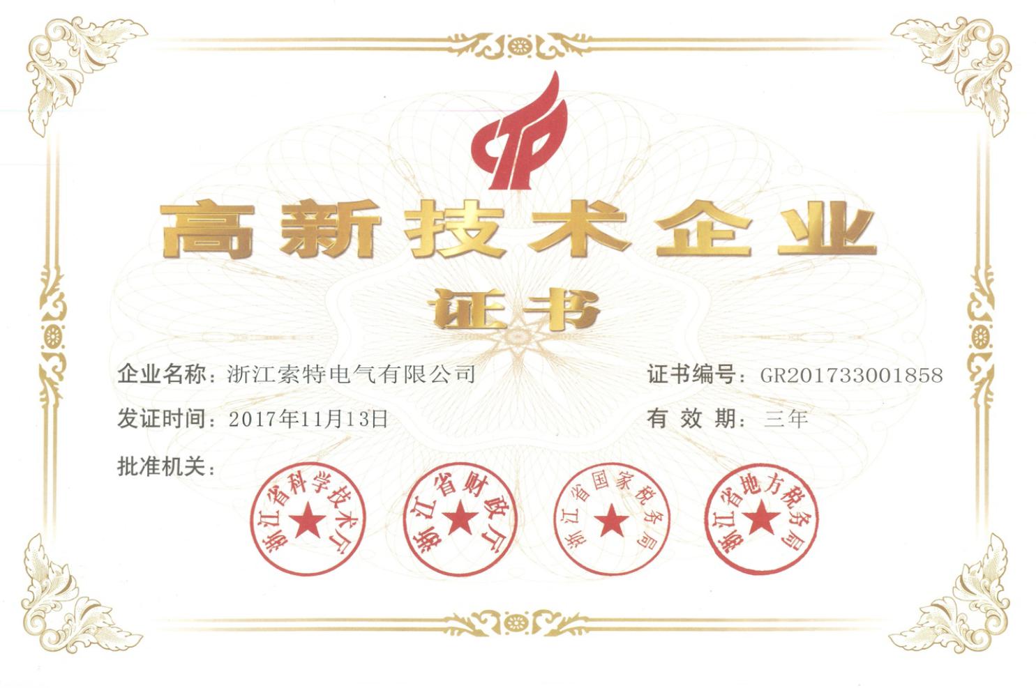扫描二维码2017年11月是浙江索特电气有限公司发展过程中具有里程碑的一月。浙江索特电气有限公司通过全体员工的努力和各部门的紧密配合,经过多年在技术方面的突破和积累,为浙江索特电气有限公司积累了沉淀了坚实的技术基础,获得了国家相关部门的认可及支持,在2017年11月13日浙江索特电气有限公司获得国家级“高新技术企业”荣誉证书,证书编号GR201733001858,为公司进一步发展打开了新的局面。
